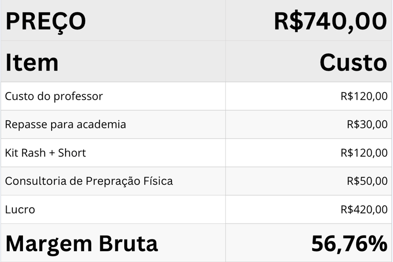 O racional para a precificação do camp foi feito de acordo com a planilha acima, com margem de lucro de mais de 56%, visando a divisão desse lucro em 50/50 (50% para a academia e 50% para o professor).