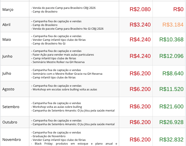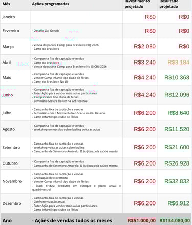 Diagnóstico do negócio, estudo de mercado, definição de metas, construção de produtos e plano de ação mensal.